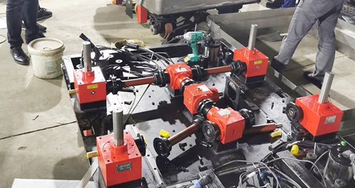 多臺聯動絲桿升降機平臺,電機在中間,電機連接轉向箱或者K系列減速機,在通過連接桿和···